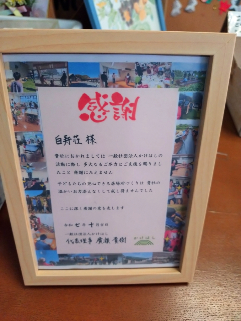 感謝状には、「貴社におかれましては一般社団法人かけはしの活動に際し 多大なるご尽力とご支援を賜りましたこと 感謝にたえません」との言葉に続き、