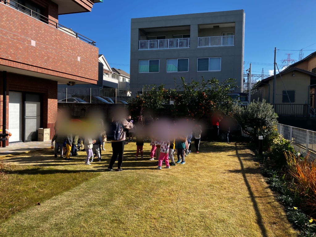 12月12日(金)10:00〜11:30、白寿荘の芝生広場に、和泉保育園の年少・年中・年長組、約70名の子どもたちが来荘しました!