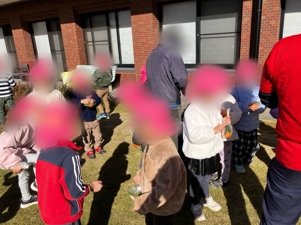 冬の澄んだ青空の下、元気いっぱいの子どもたちと一緒に 「みかん狩り体験」 を楽しみ、笑顔あふれる交流のひとときとなりました。