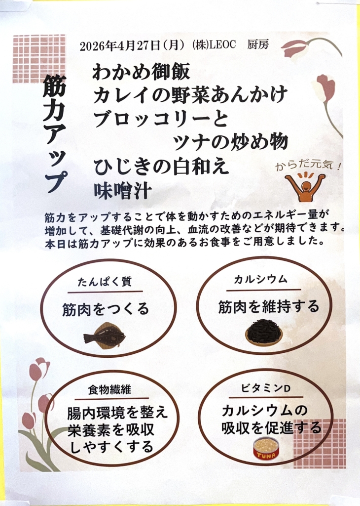 本日は、昨日4月27日に当施設で提供された「筋力アップ」をテーマにしたお食事をご紹介します。