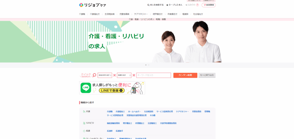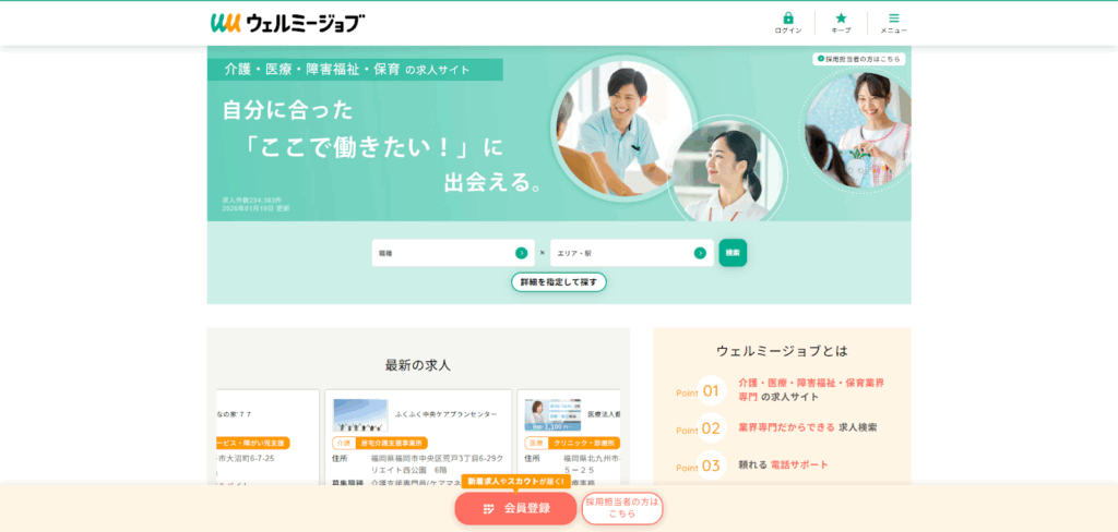 また、検索できる職種が豊富で「介護職・ヘルパー」や「サービス提供責任者」だけでなく、障害分野の「移動介護従事者(ガイドヘルパー)」や「重度訪問介護従事者」なども指定して検索可能です。介護分野だけでなく、障害分野も含めて検討している方におすすめの転職サイトです。