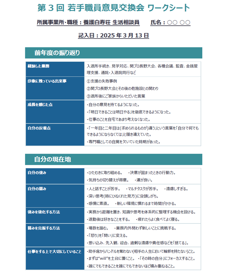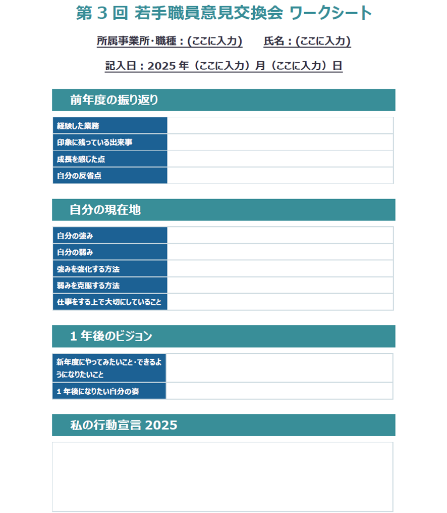 「1年後、どんな職員でありたいか」を軸に、若手一人ひとりがこれまでの業務を振り返り、成長や反省、大切にしている価値観、そして目指す姿を言葉にしました。