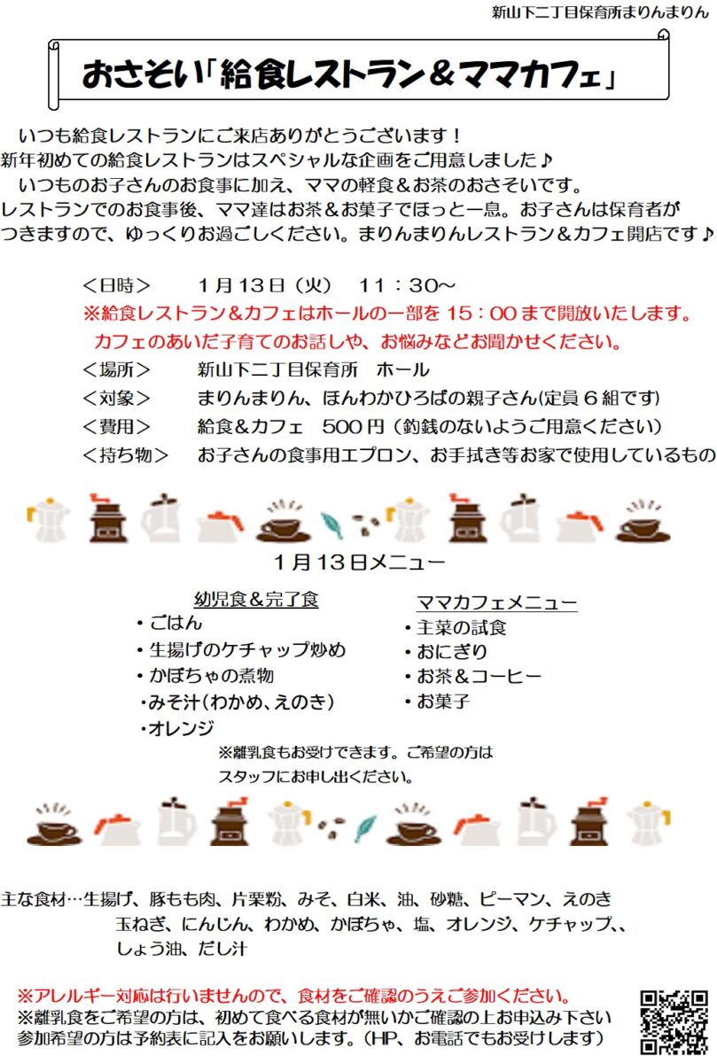 1月13日(火)「給食レストラン&ママカフェ」おさそい開始しました! | まりんまりん | 新山下二丁目保育所