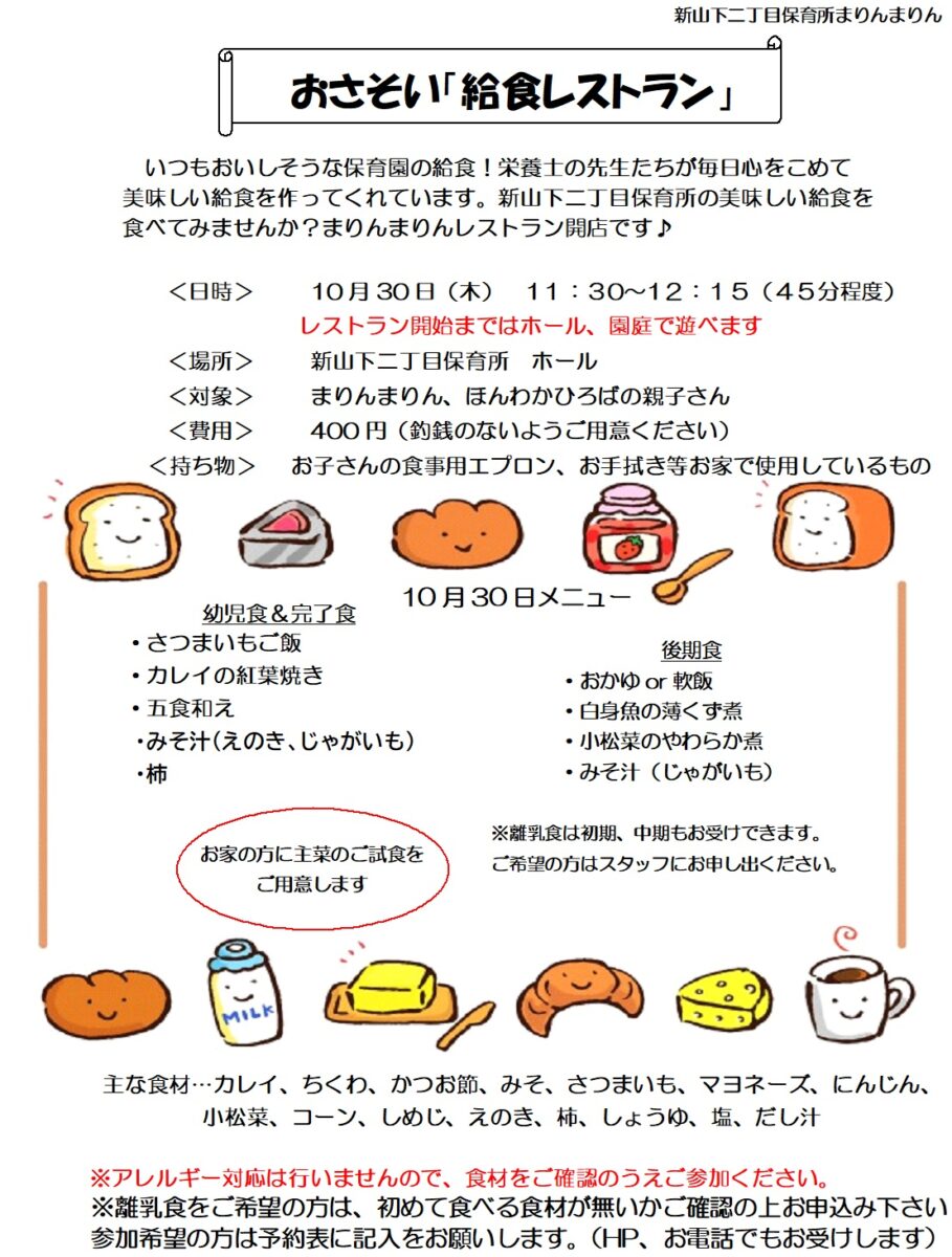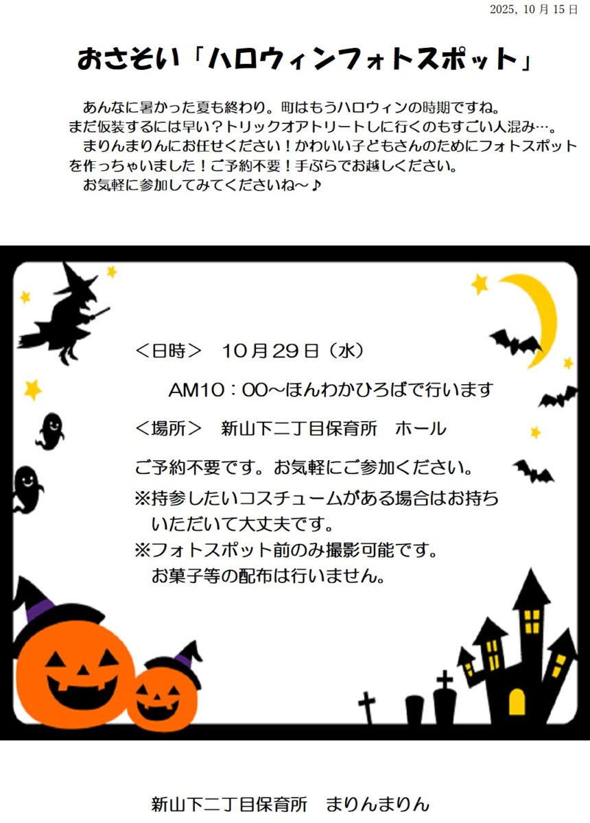 10月29日(水)「ハロウィンフォトスポット」開催します!こちらはご予約不要です。10月30日(木)「給食レストラン」ご予約開始しました!11月8日(土)「ファミリーデイおいもさがしゲーム」もご予約開始です! | まりんまりん | 新山下二丁目保育所