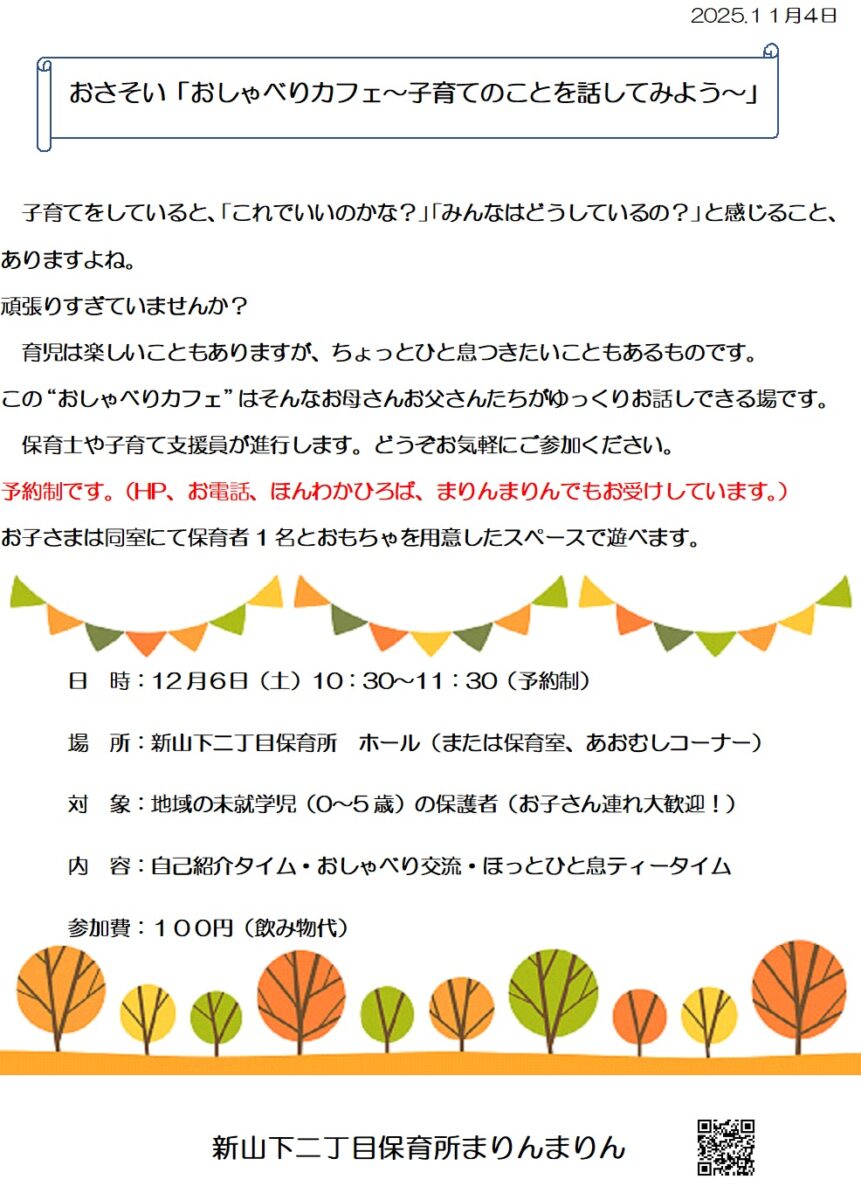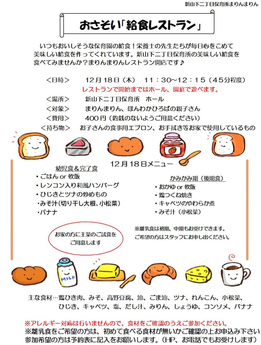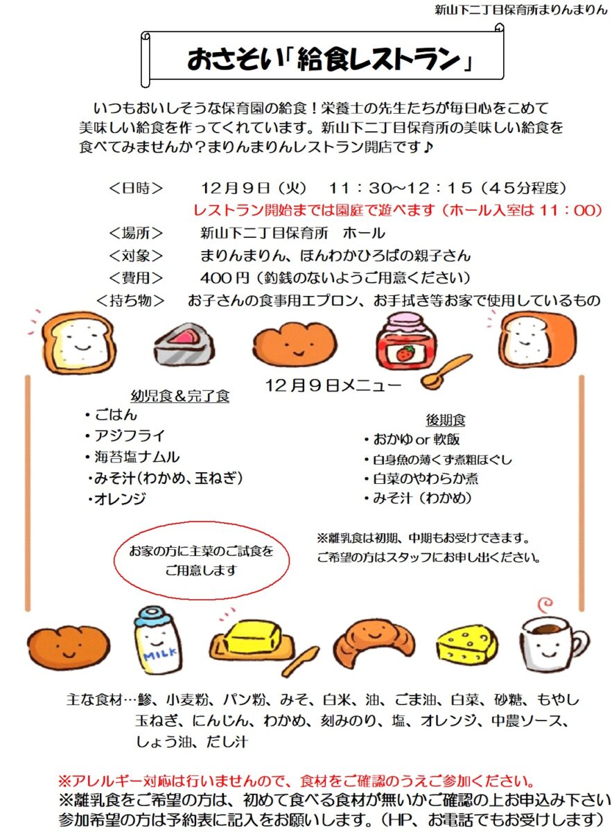 12月9日(火)、12月18日(木)の給食レストランは定員に達したため、ご予約を終了しました。12月6日(土)おしゃべりカフェは引き続き受付中です。 | まりんまりん | 新山下二丁目保育所