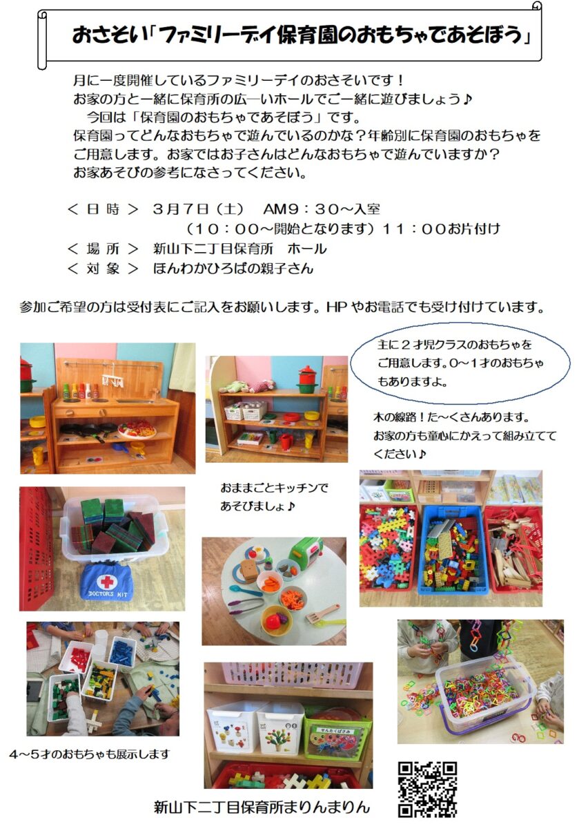 3月7日(土)「ファミリーデイ保育園のおもちゃであそぼう」、3月3日(火)「給食レストラン」のおさそい開始しました。 | まりんまりん | 新山下二丁目保育所