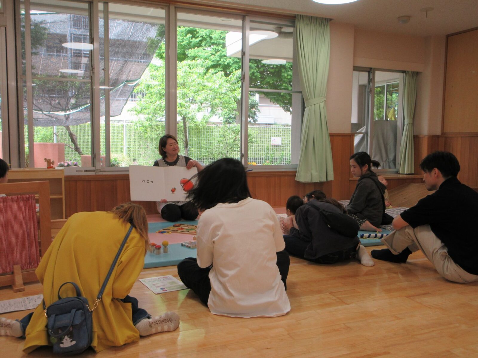 各クラスをまわるツアー終了後はホールで大型絵本の読み聞かせ♪ のんびりんこ参加の親子さんたちです。