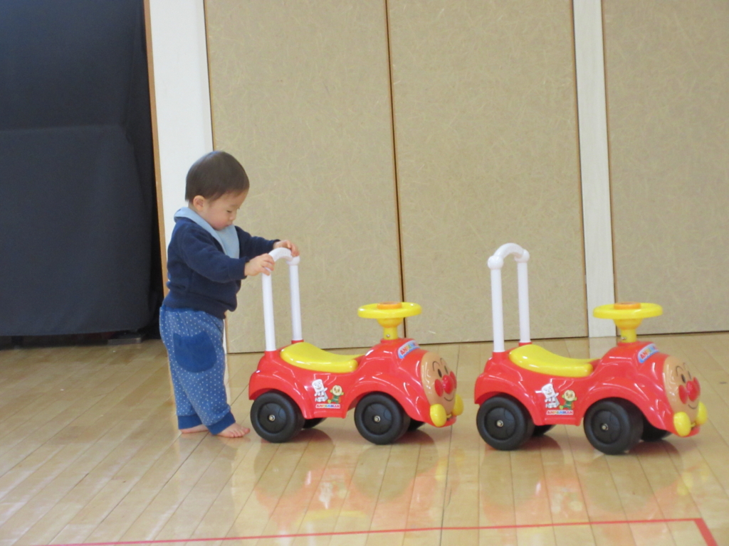一人であんぱんまんカーを2台、よいしょ、よいしょって押しているよ。