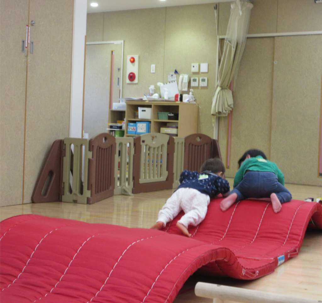 お友達と一緒に、マットでできたお山に登ったよ。