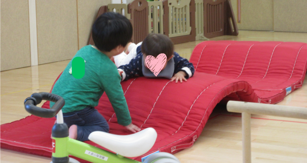 お友達と一緒に、マットでできたお山に登ったよ。