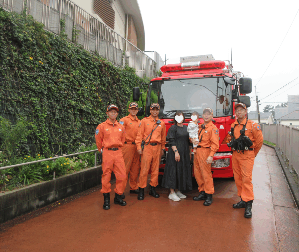 ママと一緒に,なんと消防士さんに抱っこしてもらって写真を撮ったよ!✨