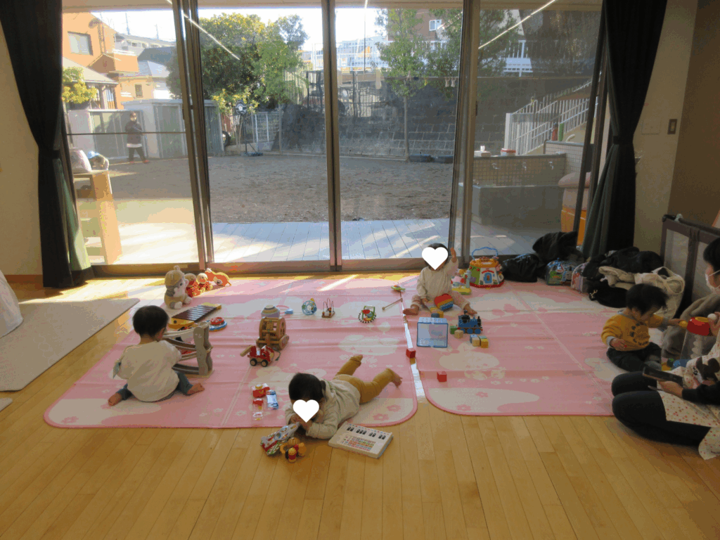 こどもたちは、おもちゃで楽しく遊んで過ごしています。途中でお母さんのところへ行きたくなった場合も、もちろん大丈夫です。お子さまは自由に遊びながら、お母さんは安心してご参加いただけます。
