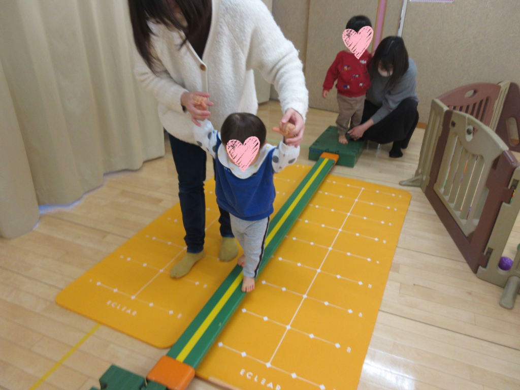 次は平均台にチャレンジ。最初はちょっぴりドキドキだったけれど,ママに手伝ってもらって何度も挑戦するうちにコツをつかんでスイスイ歩けるようになったよ😺