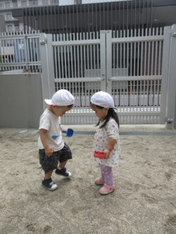 砂の感触を確かめたり、保育者と一緒に型抜きや、お団子作りを楽しんでいます!