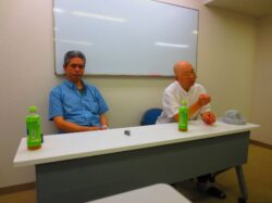 本日、お越しいただいたのは、寿アルクハマポートの戸塚施設長(写真左側)とアルク翁の横山職員(写真右側)です。お二人とも、かつては「はまかぜ」に入所されていました。アルクに通所して現在の姿がありますが、戸塚さんはソーバー歴16年、横山さんはソーバー歴19年にもなる素晴らしい方たちです。メッセージを聞いていても言葉の重みもあり、説得力も充分でした。