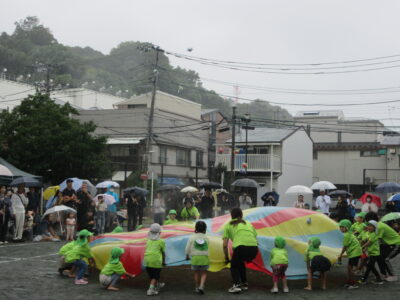 今年度はあいにくの雨でしたが、みんなの願いが天に聞こえたのか4.5歳の部では雨が弱まりました為、少しだけ外で開催。