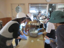 電気が消えた園内は暗いので、ヘッドライトで調理。職員も手伝います。