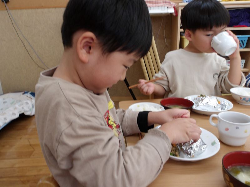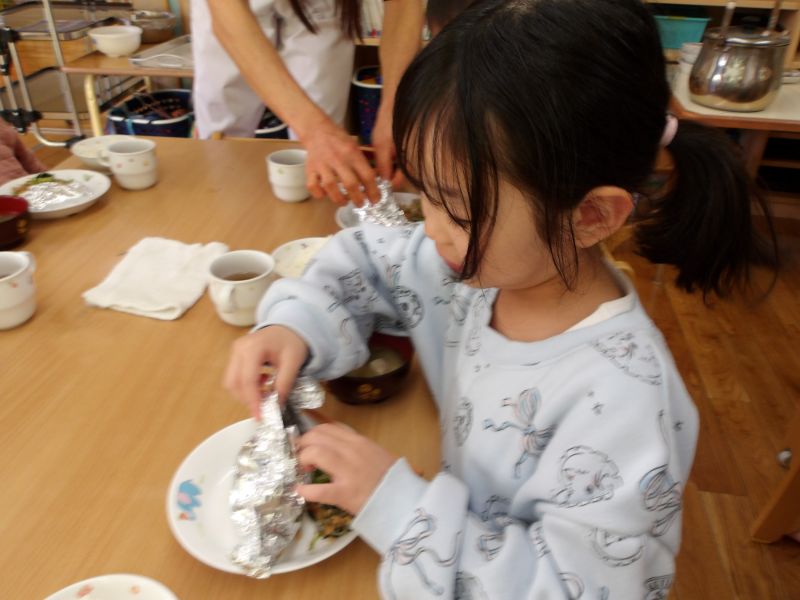 11月28日、4歳児とまと組は鮭の解体の見学と、クッキングをしました。