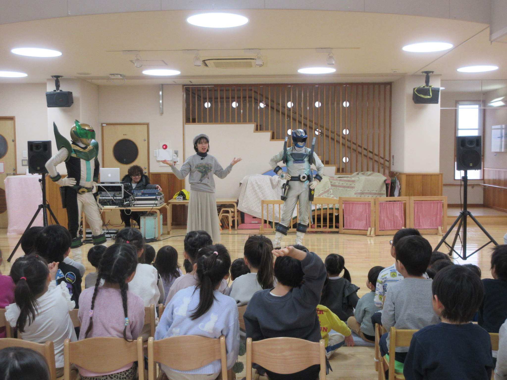 保育所にヒーローが来て、防犯教室を開催しました。ヒーローの名前はスター☆ジャン!