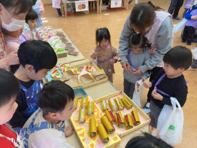 3,4,5歳児は縦割りのグループで、夏からお店を決めて、コツコツと品物作りをおこなってきました。